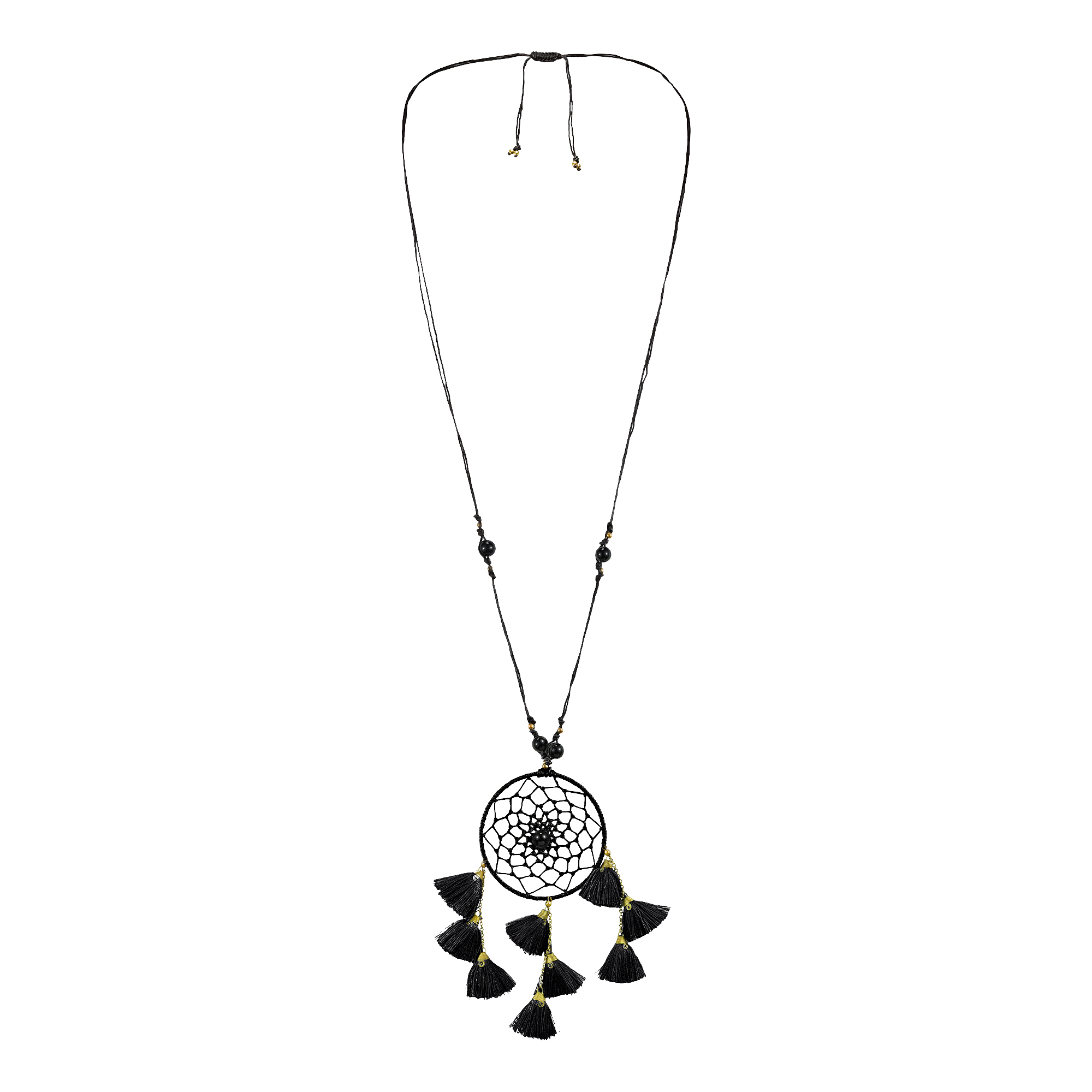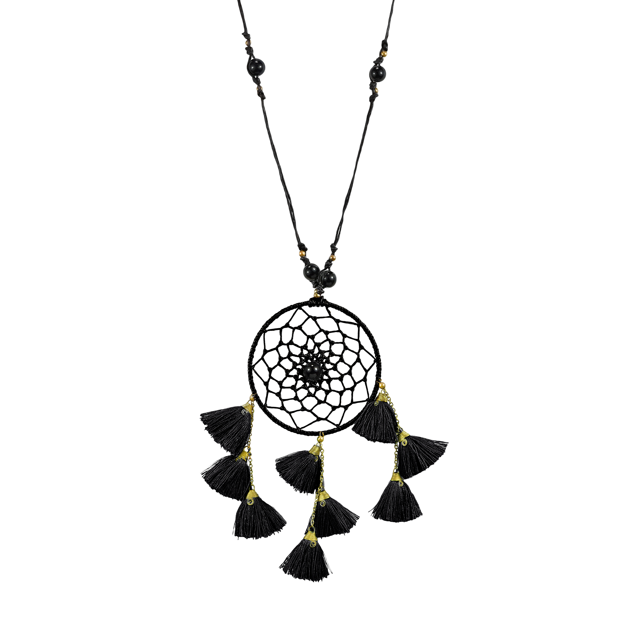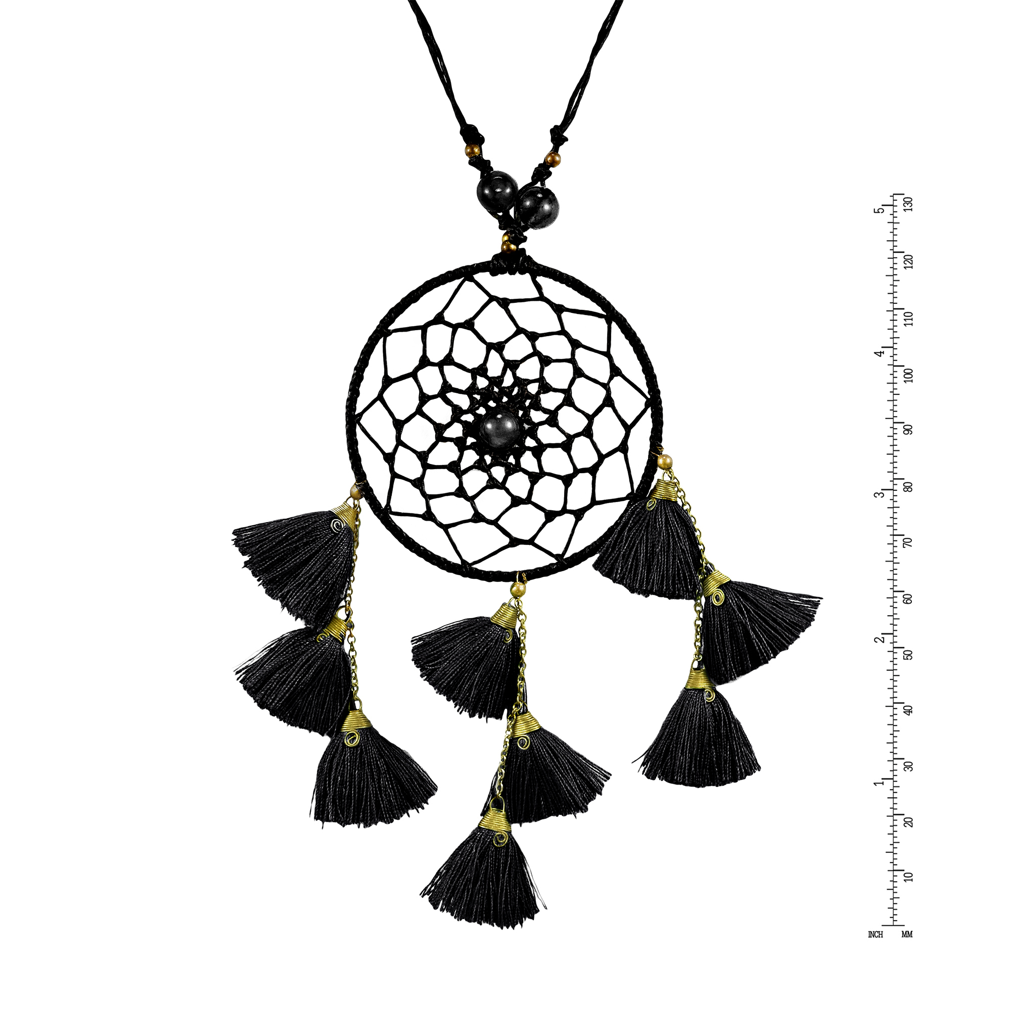 Add a beautifully crafted accent to any outfit with this amazing dreamcatcher necklace from Thai artisan Kannika. The dreamcatcher is a Native American talisman that is believed to protect those who are sleeping from bad dreams. They catch negativity and bad thoughts and dispose them when the sun arises. This beautiful necklace features a dreamcatcher made with cotton wax rope and then decorated with stone beads. Colorful tassels hang below, adding both style with movement. An elegant handcrafted piece, this necklace will look amazing with whatever you are wearing. This design comes in a variety of stone bead and color variations to choose from.