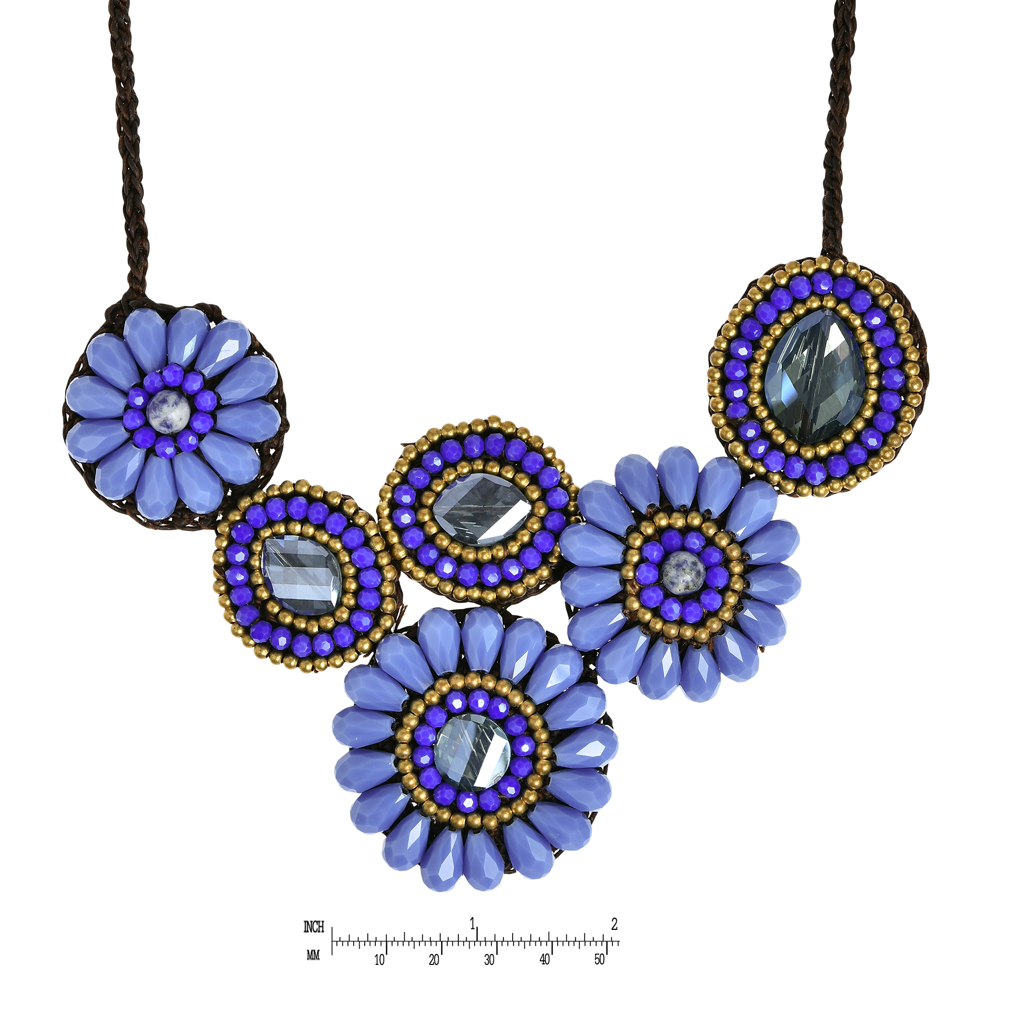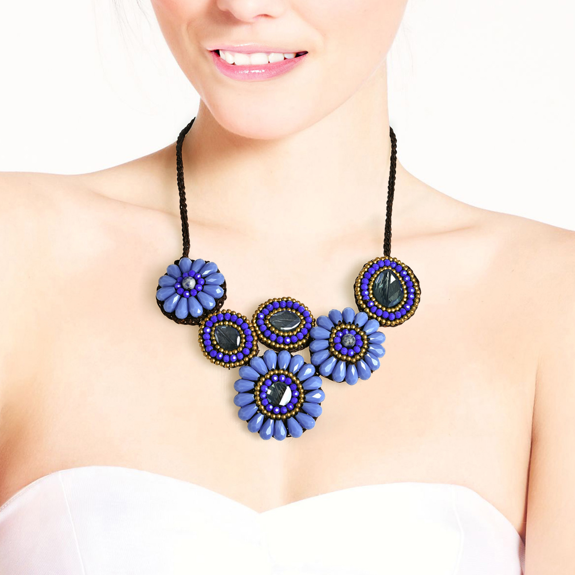 This floral inspired necklace is hand crafted from an amazing combination of crystals and beads. Thai artisan Tor has created an intricate design inspired by the tropical flowers that grow in abundance in his native Thailand. This necklace is sure to add that bold and unique touch to any outfit.