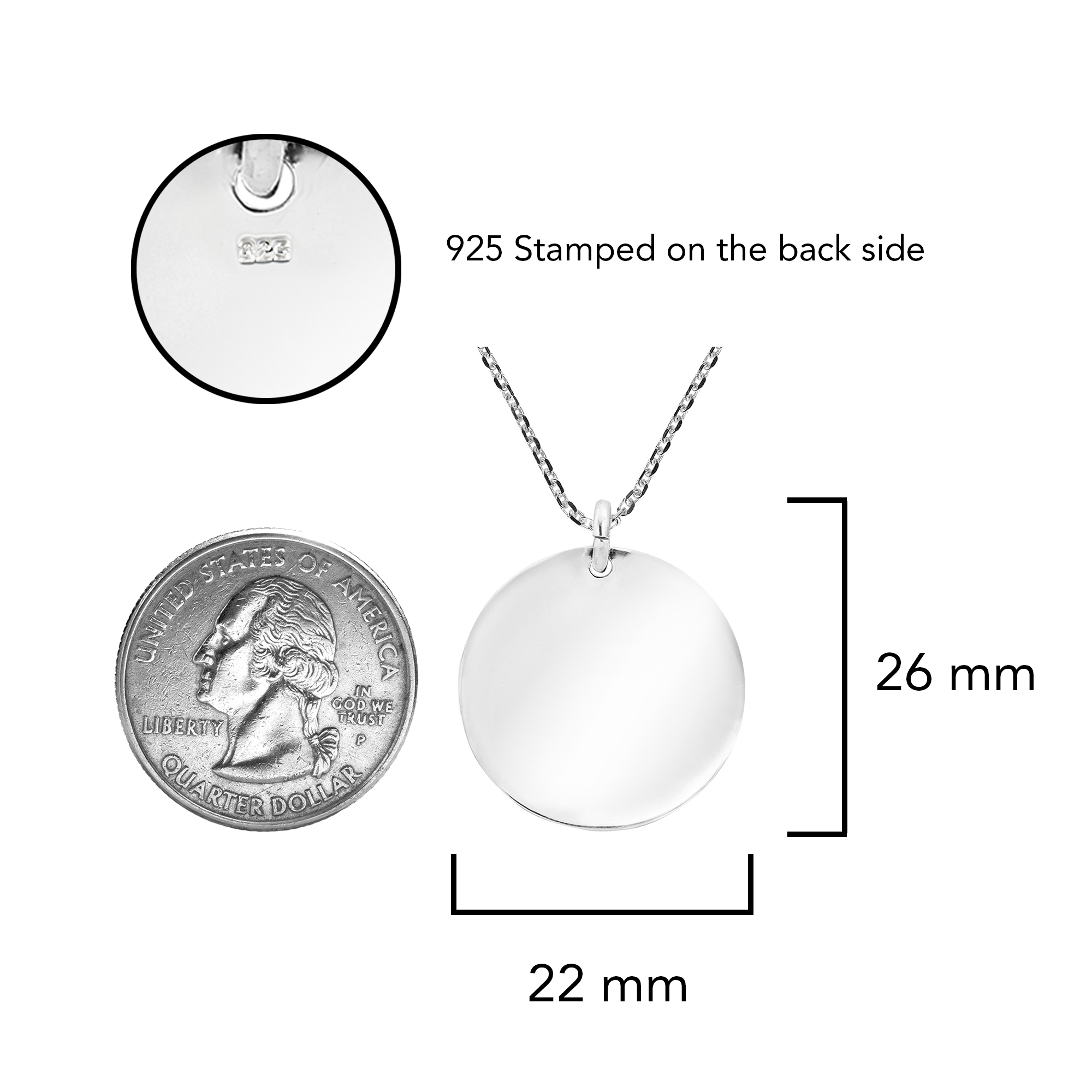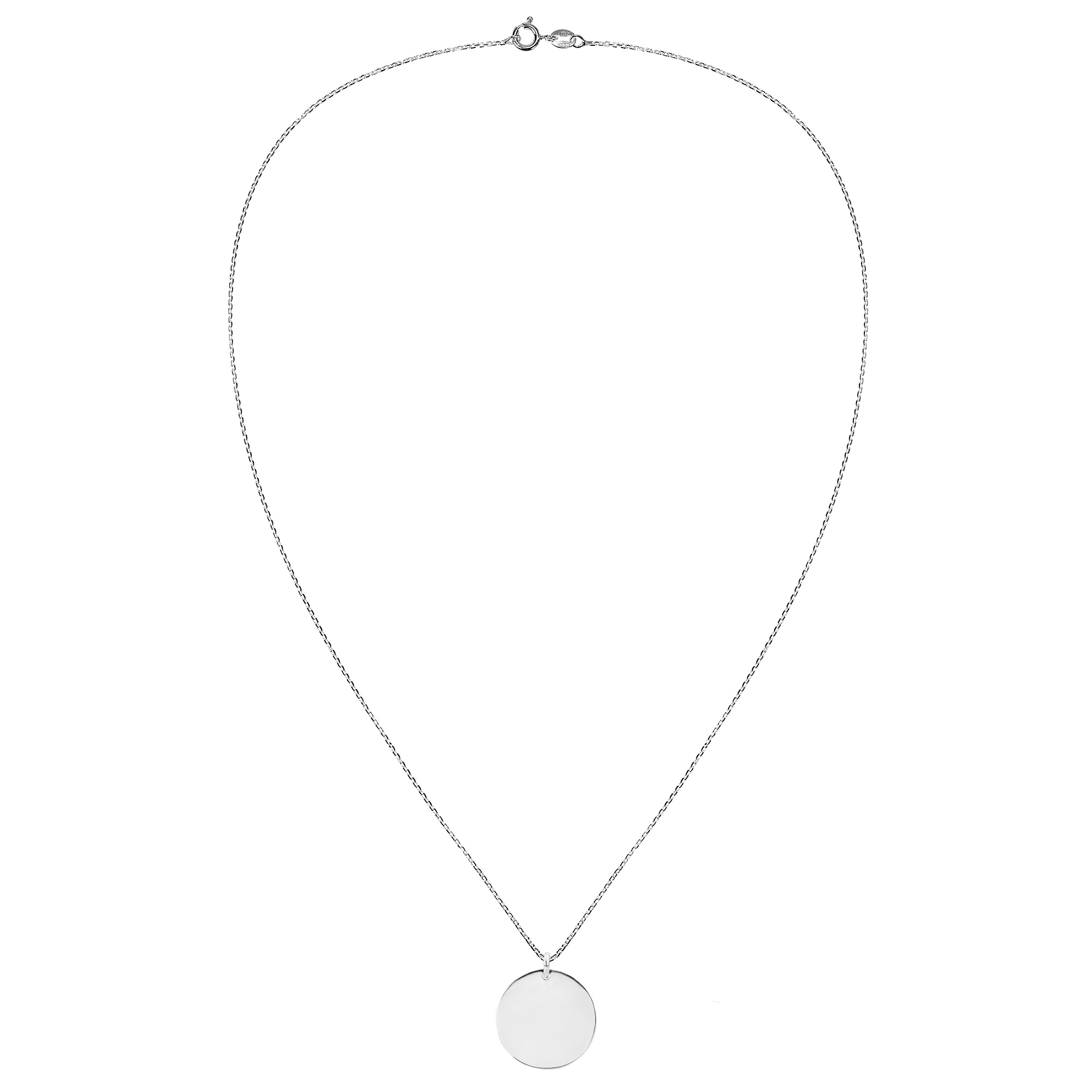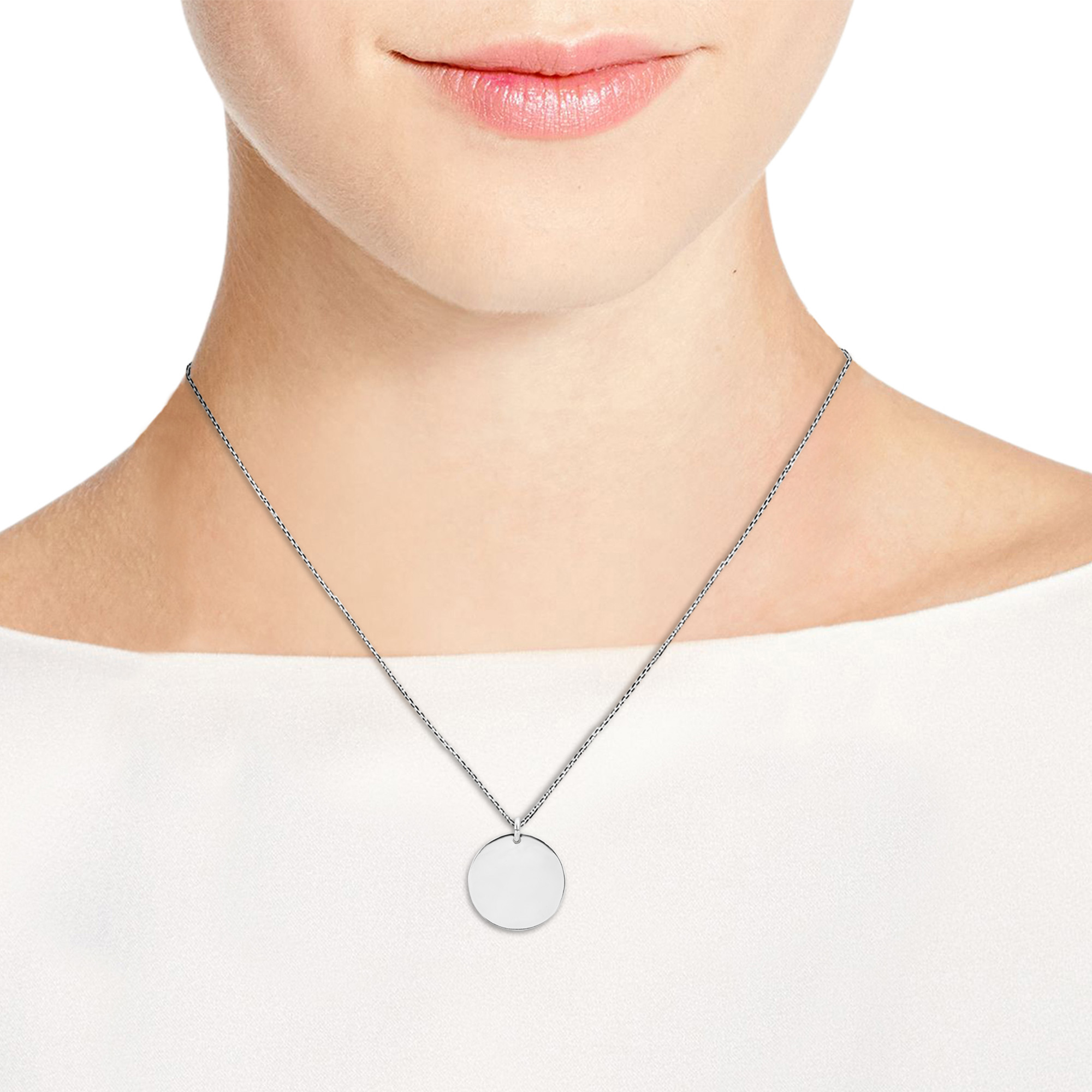 This simple necklace is a blank canvas for you to personalize. This sterling silver pendant is shaped into a perfect circle and has a diameter of 22 cm. Perfect for engraving, this piece sits on a sterling silver cable chain, that measures 18 inches. The necklace is then finished off with a spring ring closure. This basic design can also stand on its own, as the circle is a powerful symbol that represents the circular nature of life and death, also known as the circle of life. The circle is also symbolic of the celestial bodies in the universe. The circle’s basic shape represents the moon, the planets and even the sun. This versatile piece leaves room for you to add your own personal touch or can be a simple yet stylish addition to your outfit.