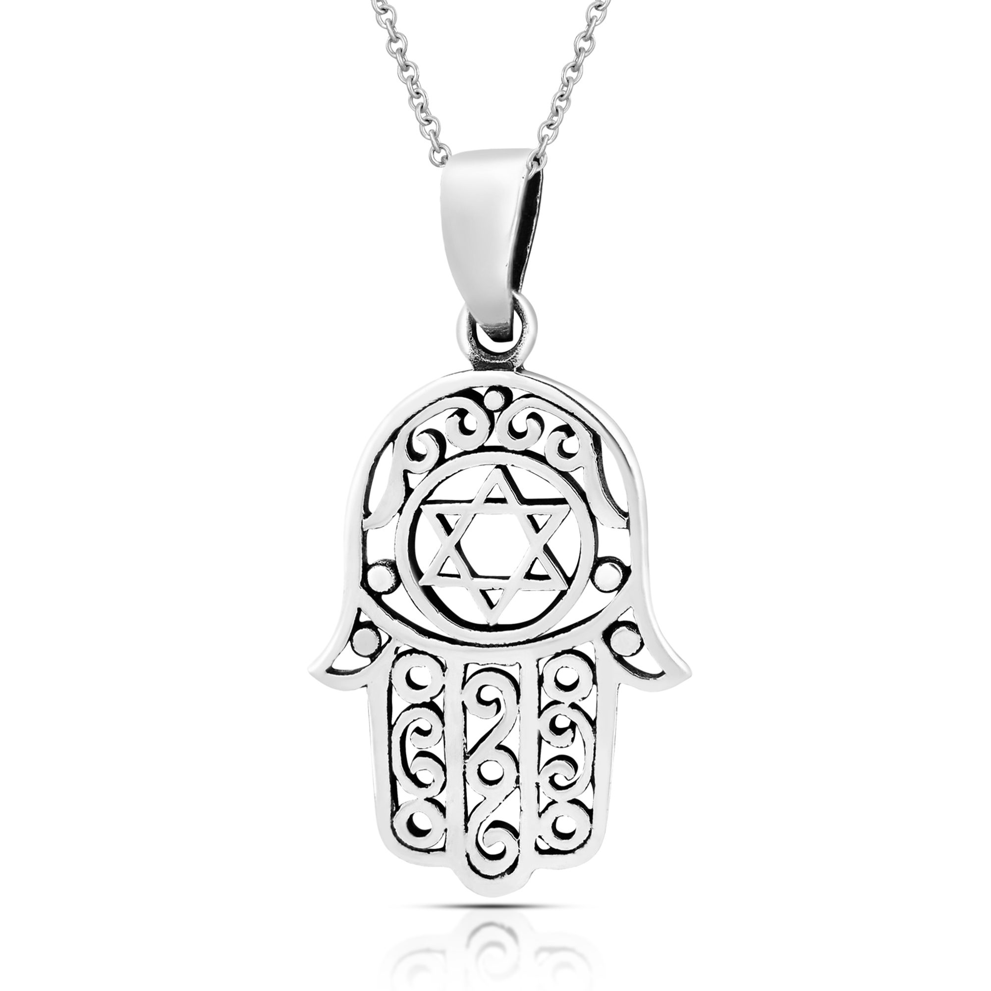 This intricately designed necklace features the Hamsa or Hand of God paired with the Star of David. A universal sign of protection, this iconic pairing is also known to represent peace between Islam and Judaism. A beautiful message that is incorporated into one amazing piece. This pendant is handcrafted from the finest sterling silver by Thai artisan Khun O and sits on a cable chain measuring 18 inches that is finished off with a spring ring closure. A truly meaningful and stylish necklace that will look great with whatever you are wearing.