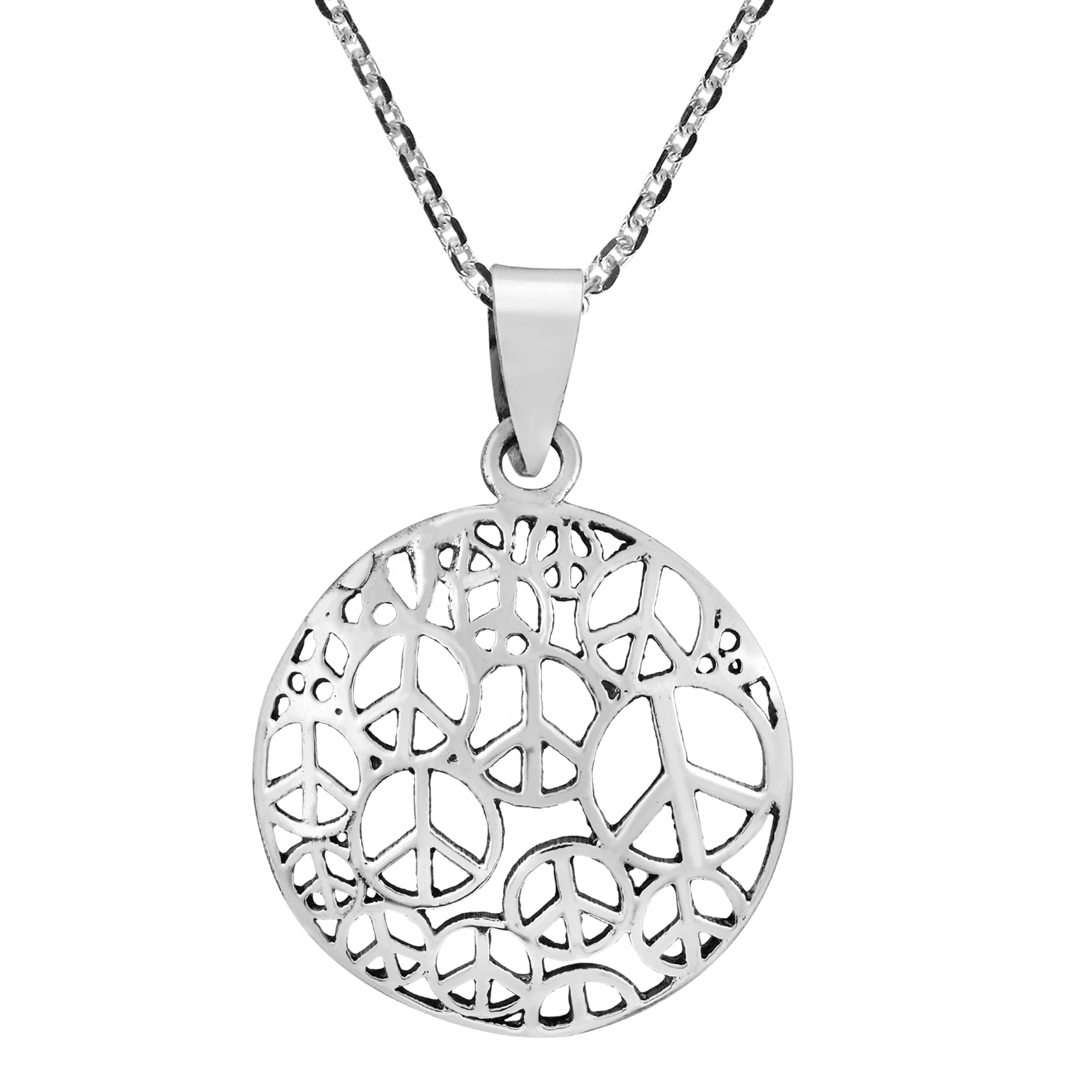 A beautiful and modern composition of the iconic symbol of peace from artisan Thip from Thailand. Inspired by the stylish peace symbol, this pendant carry the beautiful message of spreading love and ending war. Made from fine sterling silver and featuring a round frame embellished with mini peach symbols, this charmed necklace will bring a cool 60’s feel to whatever you are wearing.