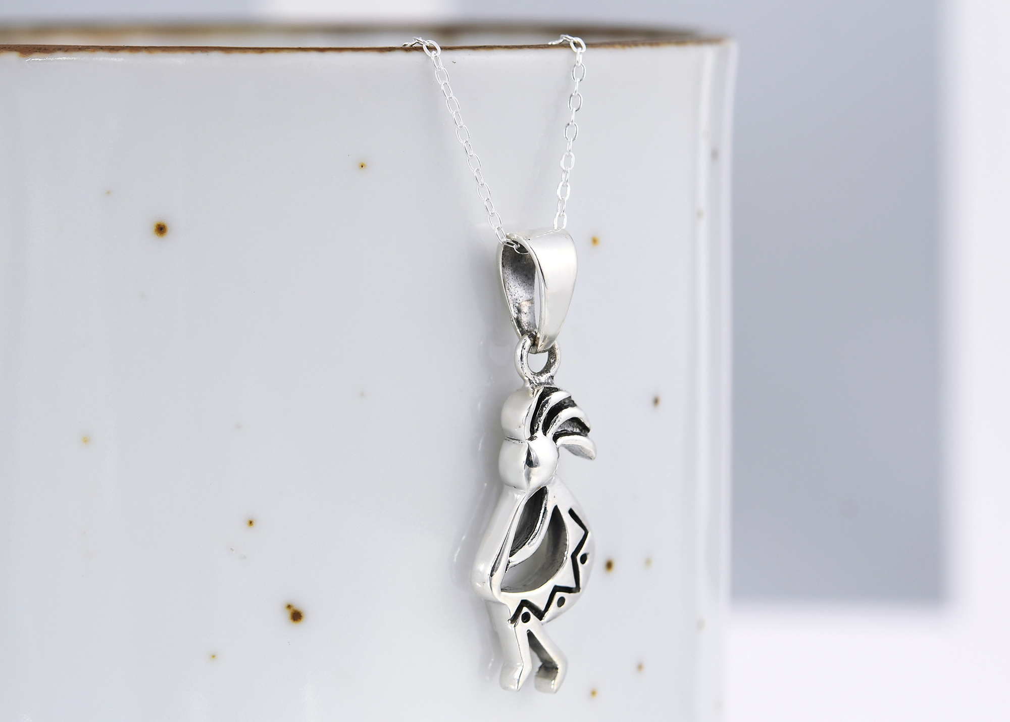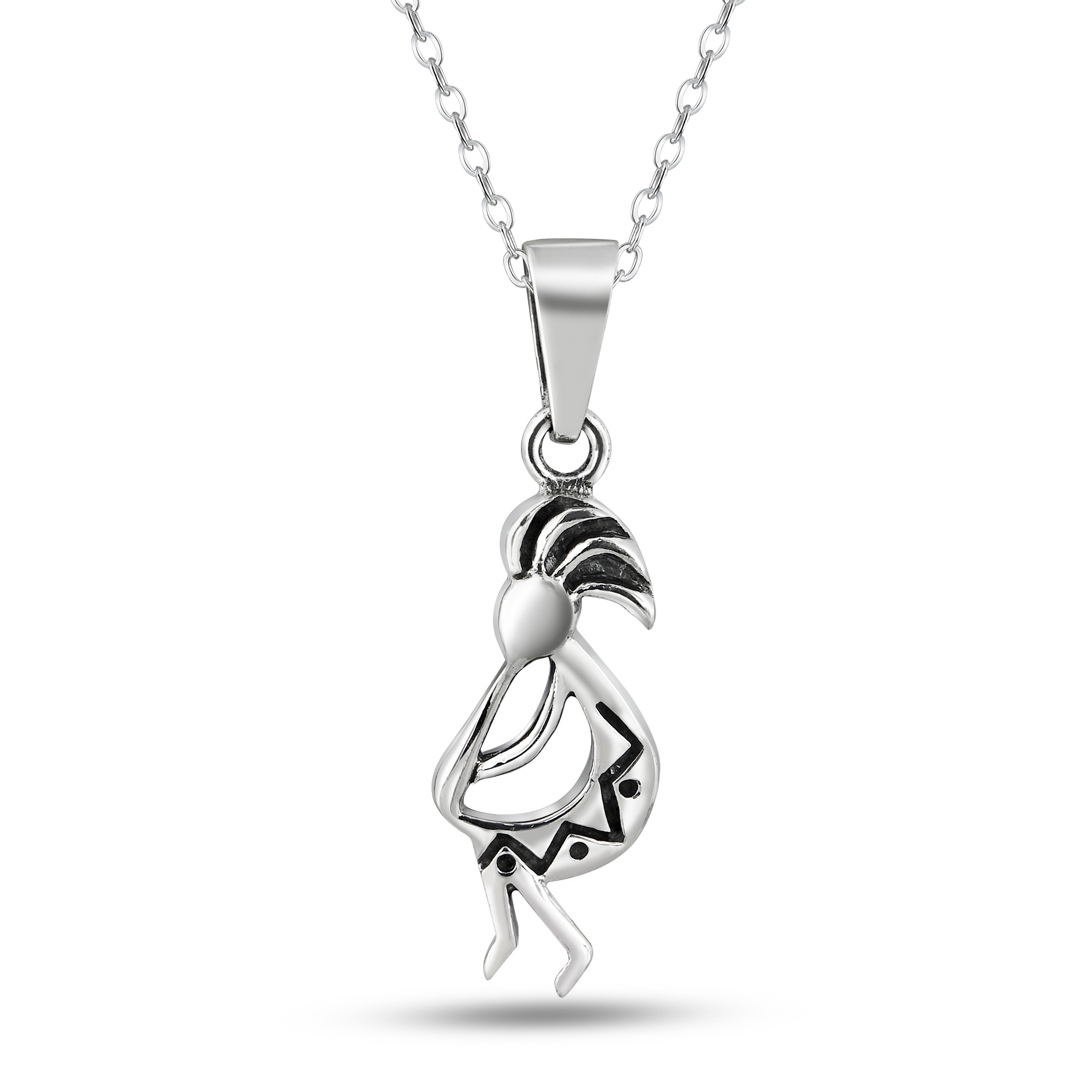 Handcrafted by the talented artisan Khun O' from Thailand, this fun and stylish pendant features a Kokopelli figure made with sterling silver. The Kokopelli is a fertility deity who presides over both childbirth and agriculture. This deity is revered by many Native American cultures located in the Southwestern part of the United States. The Kokopelli is also known as a trickster god and represents the spirit of music, that is why he is depicted playing a flute. This beautifully detailed pendant is presented on a sterling silver cable chain that measures 18 inches, and is finished off with a spring ring closure. A truly trendy and meaningful necklace that will look amazing on you.