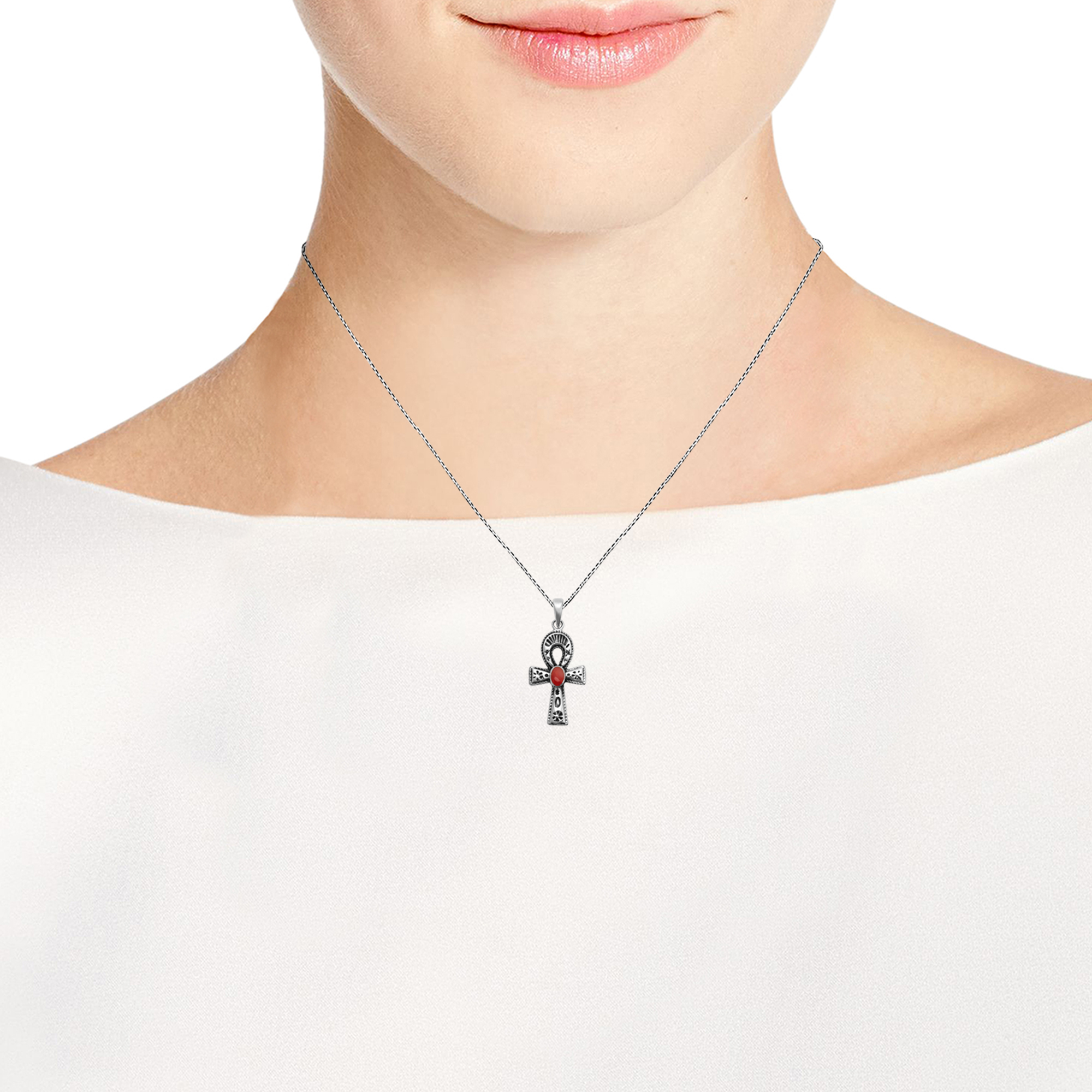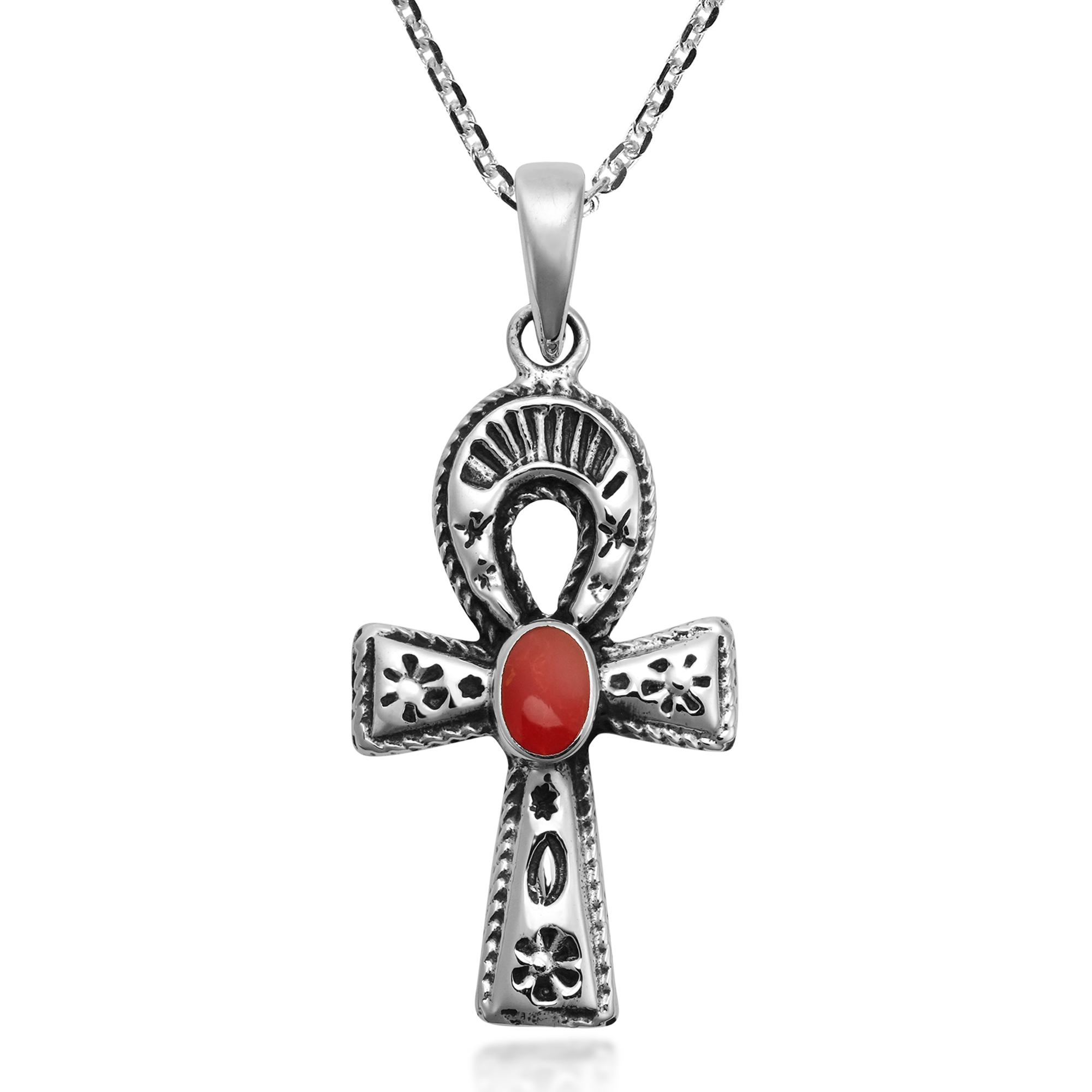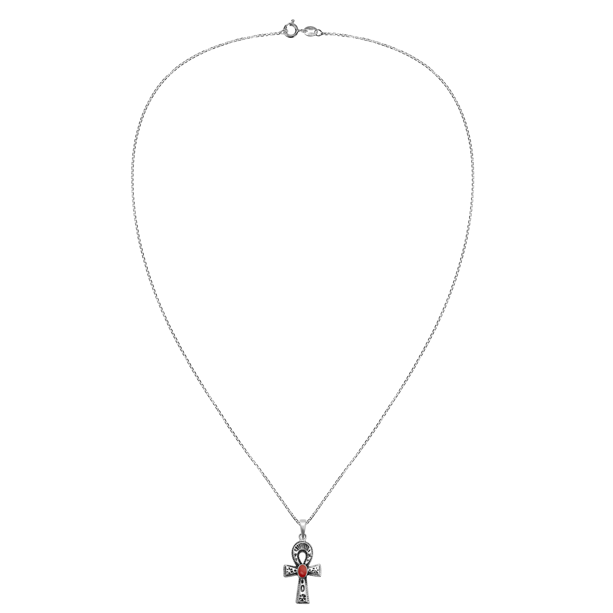 This cool and stylish necklace features the Ancient Egyptian hieroglyph, the Ankh, which represents the gift of eternal life given to man as a gift from the Gods. Embellished with unique and detailed ornaments, this unique pendant is then accented with a colorful stone inlay. Handcrafted by Thai artisan Goong using the finest sterling silver, this pendant is then set on a sterling silver cable chain that measures 18 inches long. Perfect for all styles and outfits, this versatile necklace will look great with whatever you are wearing.