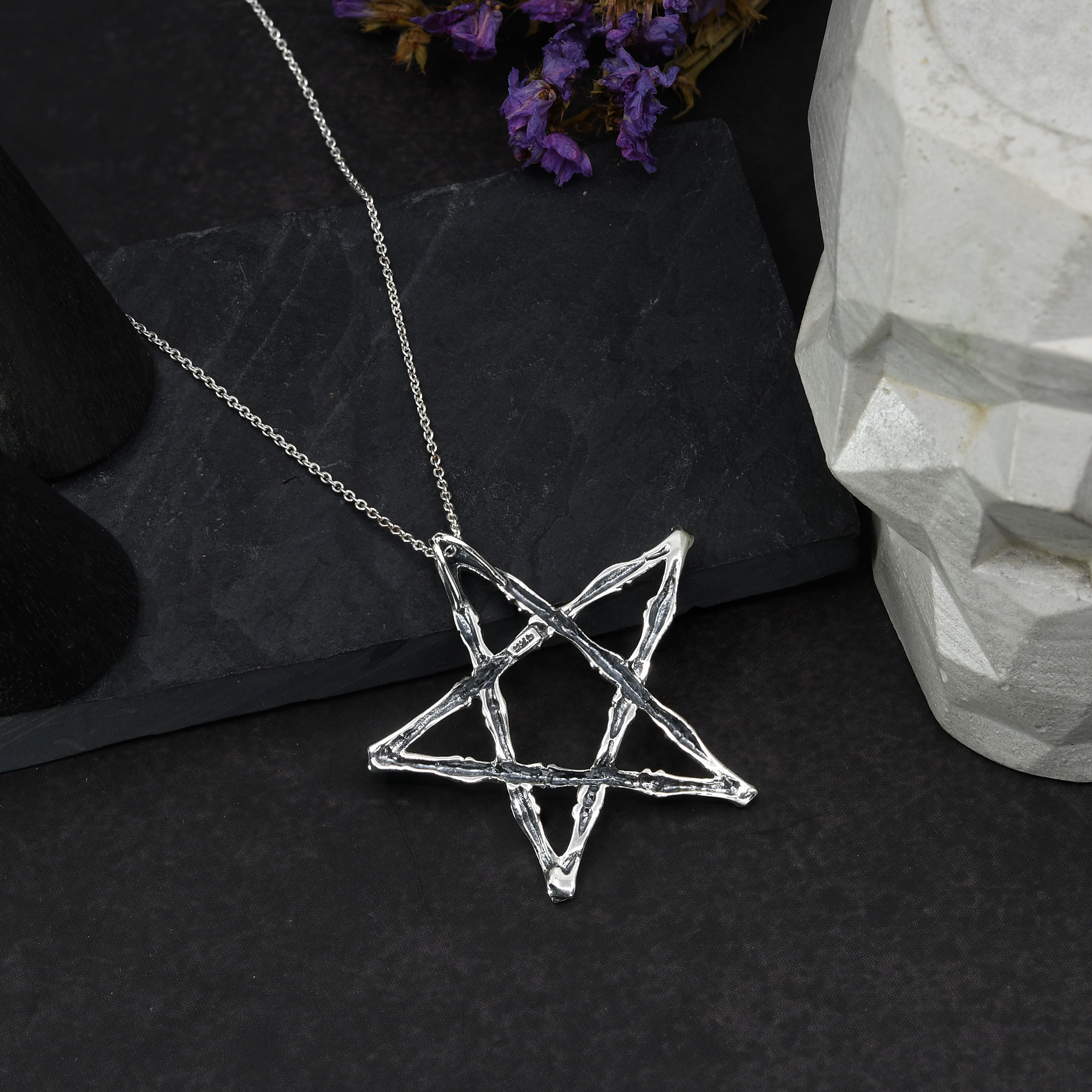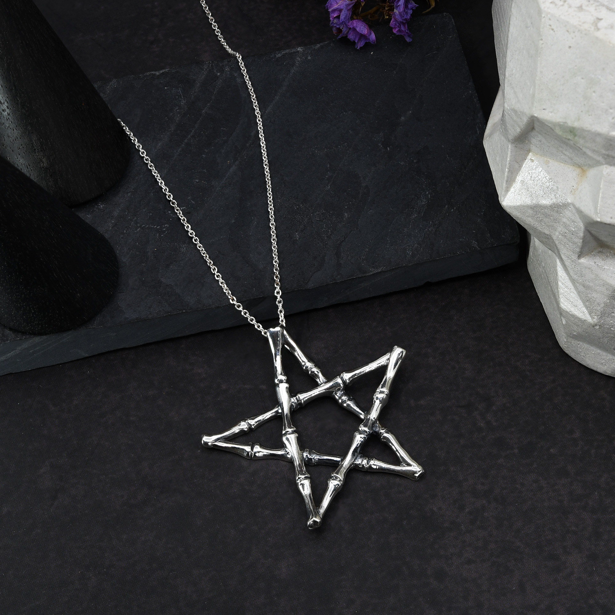 Making for an edgy yet stylish fashion accessory, this necklace from artisans Andy and Kathy is sure to look amazing on you. For this design, they use fine sterling silver to create a star or pentagram pendant made of bones. An astrological symbol associated with mystical powers, this pendant is then paired with a sterling silver cable chain. Both unique and trendy, this gothic inspired fashion accessory will make for a unique addition to your style repertoire. This piece would make a wonderful addition to your Halloween inspired outfit as well.