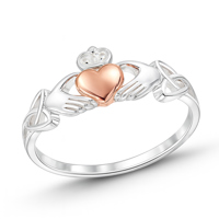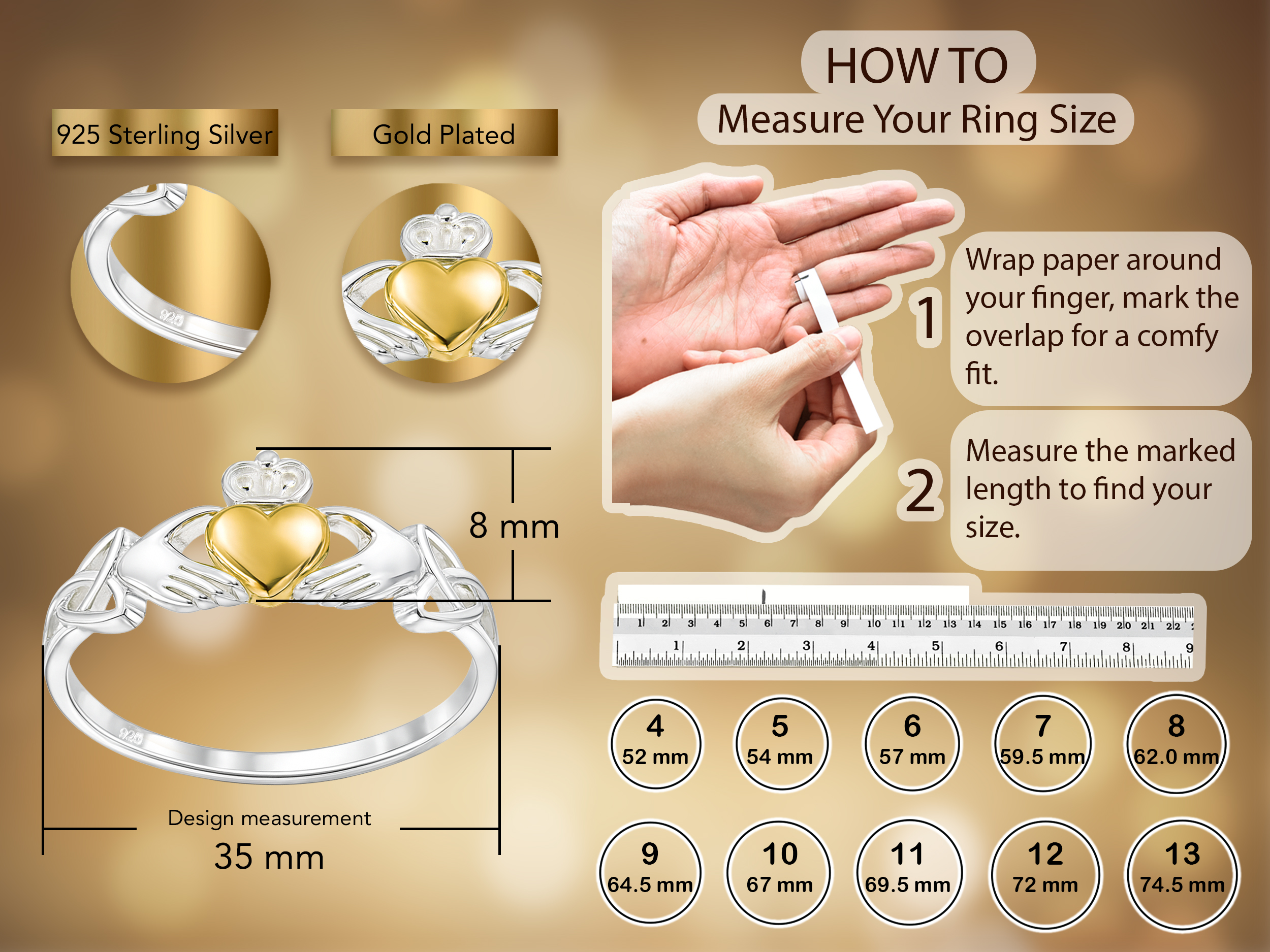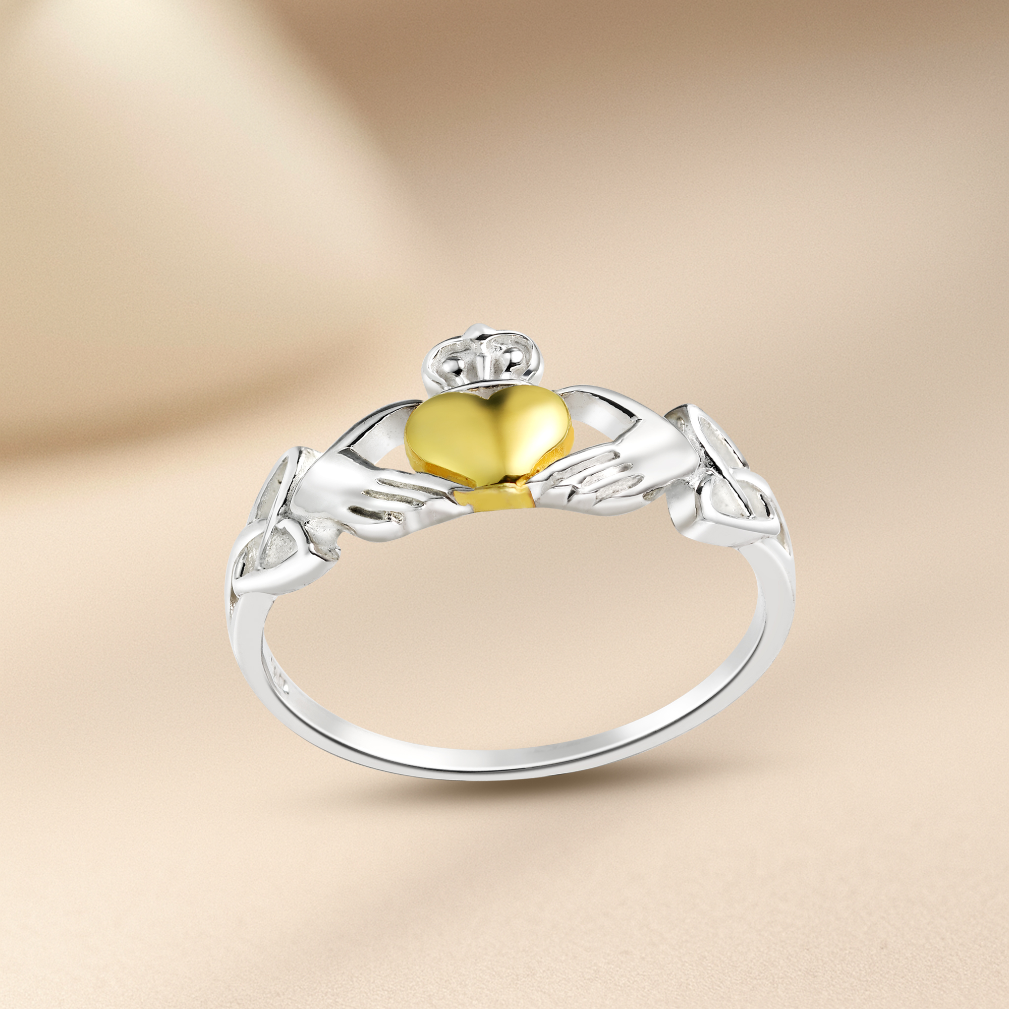 Typically given as a gift, the Claddagh ring is a traditional Irish ring which represents love, loyalty, and friendship. The band ring is made from sterling silver .925 and features a two tone gold plated vermeil heart at center. Made in Thailand by expert silversmith Khun Katsaya, this ring is a meaningful gift for friends, family members and loved ones.