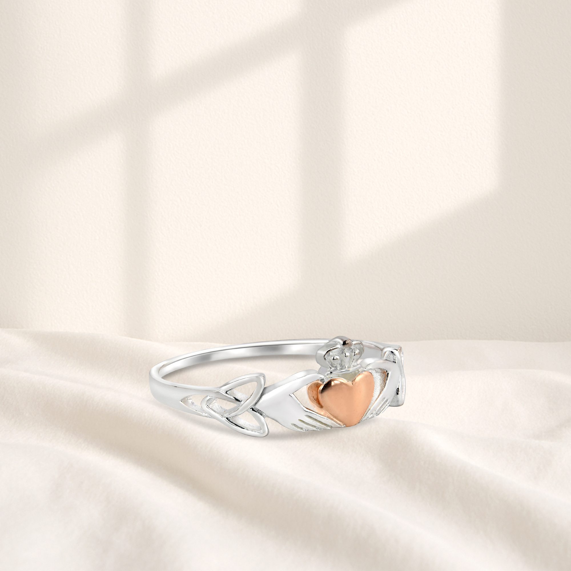 Typically given as a gift, the Claddagh ring is a traditional Irish ring which represents love, loyalty, and friendship. The band ring is made from sterling silver .925 and features a two tone gold plated vermeil heart at center. Made in Thailand by expert silversmith Khun Katsaya, this ring is a meaningful gift for friends, family members and loved ones.